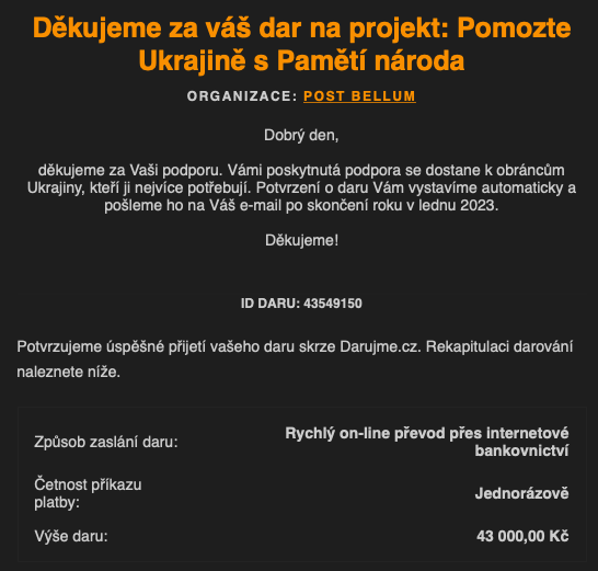 “Od 24. února čelí Ukrajina bezprecedentní invazi vojsk Ruské federace. S pohnutím jsme sledovali a sledujeme nadále odhodlání našich přátel bránit svou vlast. Proto jsme spustili sbírku, ve které můžete přispět i Vy. Za Vaše dary nakupujeme vybavení, které zachraňuje životy a zvyšuje bezpečnost obránců Ukrajiny. Zejména zdravotnický materiál, neprůstřelné vesty, balistické přilby, rukavice, spacáky, stany, vysílačky, baterie, průzkumné drony, termovize a potraviny. Díky našim ukrajinským partnerům víme, jaký materiál obráncům schází, v jakém množství a kde je ho nejvíc zapotřebí. Finanční prostředky využíváme rovněž ke zlepšení zdravotní péče dětem a lidem postiženým invazí ruské armády.”